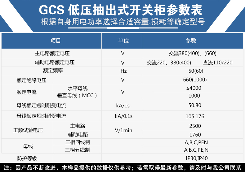 GCS是抽屜式低壓配電柜,額定頻率是50(60)HZ,額定工作電壓380(660)V,額定工作電流至 =< 4000A。