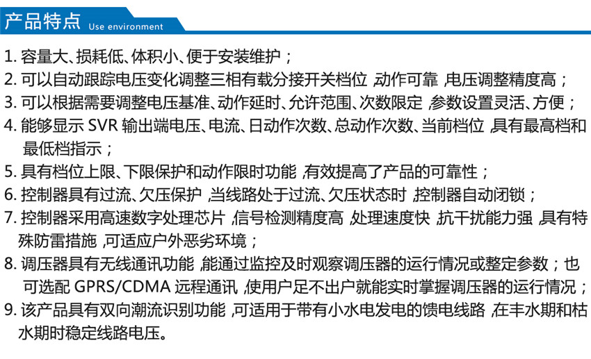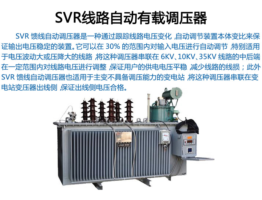 我公司生產(chǎn)的SVR型線路自動調(diào)壓變壓器原理是SVR與10kV 柱上無功自動補償裝置GWJ配合使用,可有效地解決線路電壓低及無功電源不足的問題。SVR 能有效地調(diào)節(jié)電路電壓, GWJ無功補償裝置能有效補償無功,提高功率因數(shù),降低線損,其效果相當(dāng)于一個簡易的柱上變電站,而造價僅為常規(guī)變電站的1/6~1/10。而成本只有變電站的1/6,1/7,而且無需工作人員值班維護。