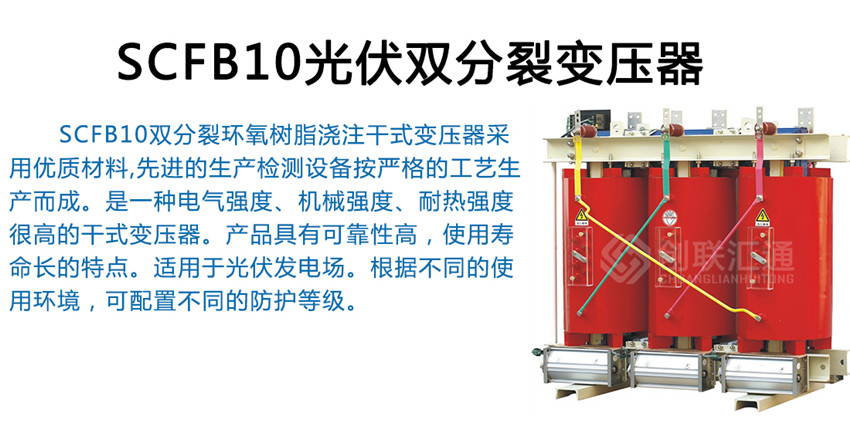 SCFB10雙分裂環(huán)氧樹脂澆注干式變壓器采用優(yōu)質(zhì)材料,先進(jìn)的生產(chǎn)檢測(cè)設(shè)備按嚴(yán)格的工藝生產(chǎn)而成。是一種電氣強(qiáng)度、機(jī)械強(qiáng)度、耐熱強(qiáng)度很高的干式變壓器。產(chǎn)品具有可靠性高,使用壽命長的特點(diǎn)。適用于光伏發(fā)電場(chǎng)。根據(jù)不同的使用環(huán)境,可配置不同的防護(hù)等級(jí)。